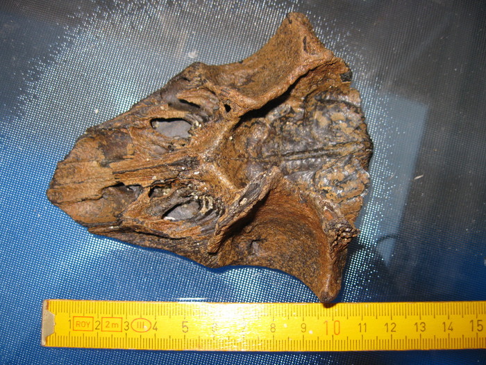 het gaat om een fragment van een schedel en meer bepaald het voorhoofddeel; je kijkt op de foto wel naar de binnenzijde, met rechts de plek waar de hersenen zich bevonden. De grote holten boven en onder moeten de oogkassen zijn; de holtes links de sinussen.