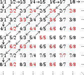 Nog wat minder intuïtief is het feit dat je ook alle rationale getallen op zo'n manier kan oplijsten! Ook die verzameling is dus aftelbaar en we kunnen spreken van het eerste, tweede, derde enz. rationale getal en ze op die manier allemaal doorlopen. De formele details (het leggen van zo een bijectie) kan je lezen via de bijgevoegde link, maar de bijgevoegde afbeelding maakt het visueel al vrij duidelijk hoe je alle (positieve) rationale getallen zou kunnen doorlopen en dus ook 'nummeren'.