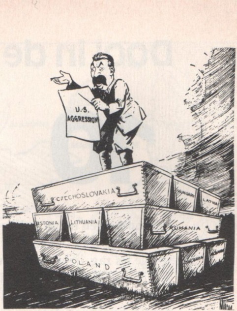 Stalin beschuldigt de V.S. ervan agressief te zijn (op zijn tekstvel staat 'U.S. Aggression'). Maar tegelijk staat hijzelf bovenop een stapel doodskisten met daarop Europese landen die door de Sovjet-Unie zelf zijn 'gedood': Rumania, Lithuania, Latvia, Poland, Hungary, Albania, Czechoslovakia, Bulgaria.