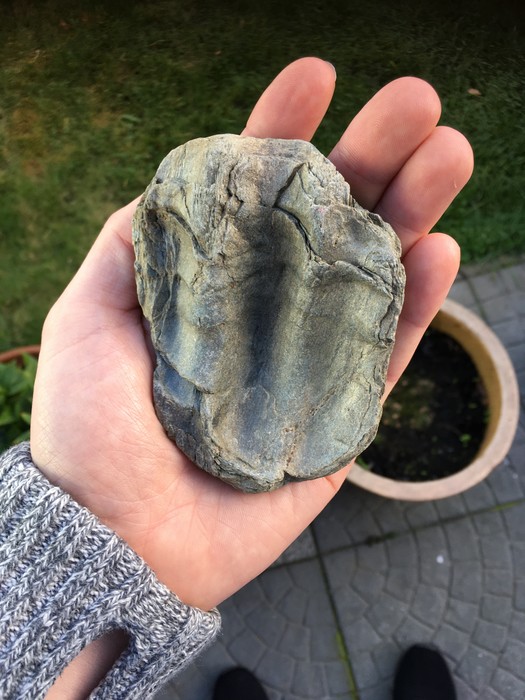 Een oordeel van een foto geeft niet altijd 100% zekerheid, maar in dit geval ben ik vrij zeker dat dit geen fossiel is maar een stuk sedimentair gesteente, bv. een kleiig of zandig gesteente. Als je op de zijkant kijkt, zie je dunne laagjes. Deze laagjes lijken onder zijdelingse druk verplooid te zijn waardoor het geheel er wat golvend uitziet. Mogelijk is het gesteente ook wat metamorf omgezet: dit wil zeggen dat de minerale samenstelling diep in de aardkorst onder verhoogde druk en temperatuur is veranderd. Dit proces gaat vaak samen met verplooiing van gesteentelagen en is een typisch fenomeen bij de vorming van een gebergte.