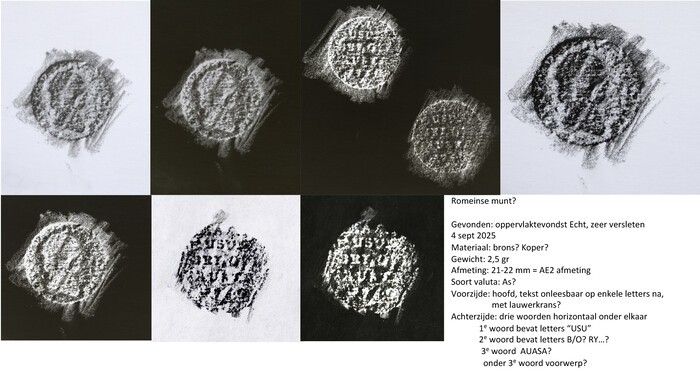 Romeinse munt met muntzijde onder andere "USU" op. Zeer slechte staat. Meer info op de foto. Wrijfafdruk munt zowel in positief en negatief met verschillende bewerkingen.