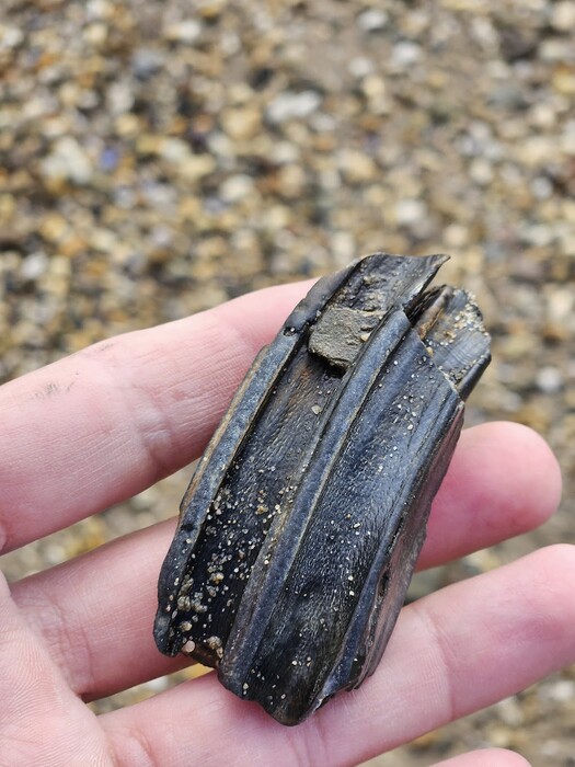 Gisteren hebben we langs de Waal bij Waardenburg waarschijnlijk een fossiele tand gevonden. We zijn benieuwd van welk dier deze afkomstig is en of het inderdaad om een fossiel gaat.